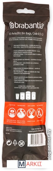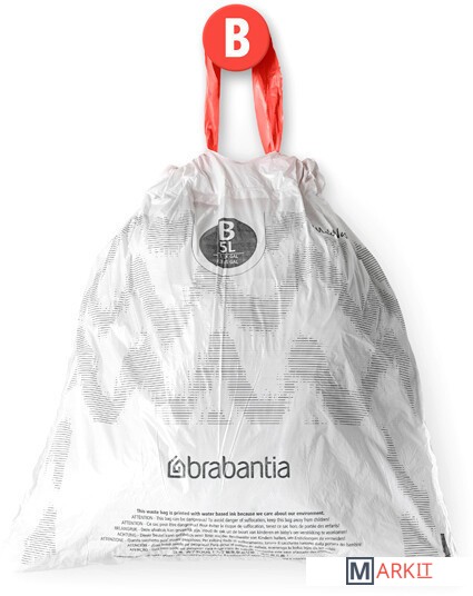 Мешок для мусора PerfectFit, код B, 5 литров, 10 штук в рулоне.Мешки для мусора Brabantia PerfectFit специально изготовлены для баков Brabantia и идеально подходят к ним по размеру. Очень прочные, со стягивающей лентой, потянув за которую, Вы легко достанете мешок из бака и, стянув горловину, легко вынесете мусор. Для выбора мешков нужного размера используйте буквенно-цветовой код на внутренней поверхности крышки Вашего бака. Идеально опрятно, идеально удобно!Идеально "по фигуре.Идеально подходят по размеру - специально изготовлены для баков Brabantia...Не рвутся - изготовлены из очень прочного пластика.Всегда опрятный внешний вид - при закрытой крышке мешок не виден.Удобно достаются из бака и переносятся - стягивающая лента.Удобная замена мешка - специальные вентиляционные отверстия, предотвращающие образование воздуха.Всегда нужный размер - цветовая кодировка.