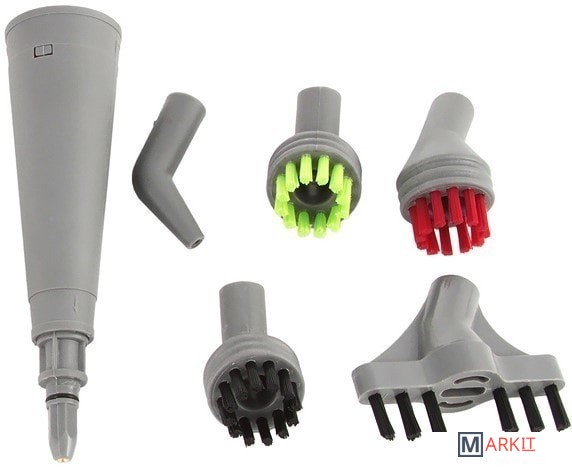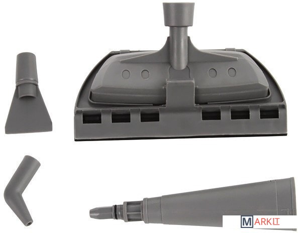 | Дополнительные насадки и приспособления | насадка для отпаривания ткани, угловое сопло, плоская насадка-скребок, круглая щётка для чистки, щётка для зазоров между плитками, мерный стакан |