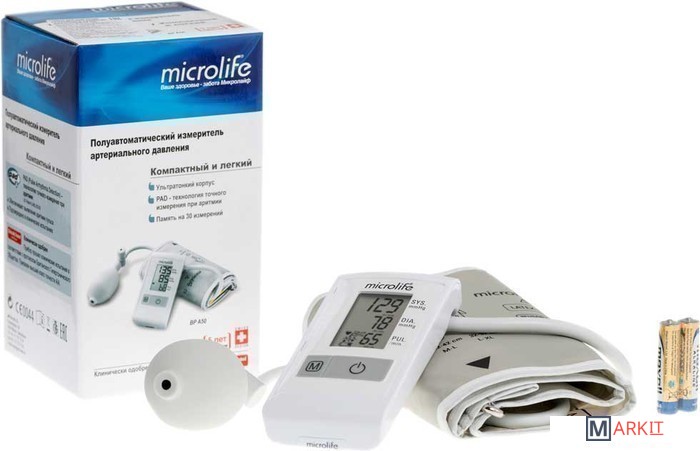 Microlife BP A50 – компактный и доступный полуавтоматический тонометр.Основные преимущества:• PAD – точное определение показателей давления при наличии любых нарушений пульсового ритма• Манжета M размера• Память на 1 пользователя (30 измерений)