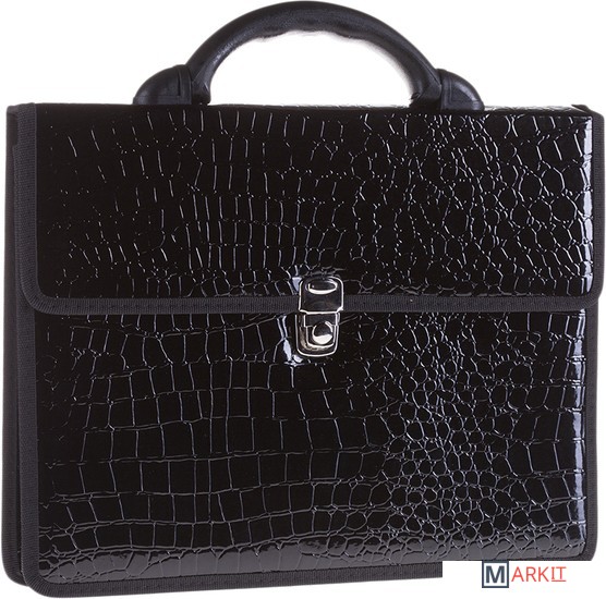 Бизнес-портфель из искусственной лаковой кожи с фактурой под кожу рептилии. Пластиковая ручка. Портфель закрывается на клапан с замком-защелкой. Украшен текстильной окантовкой. Внутри отделения для хранения документов формата А4.