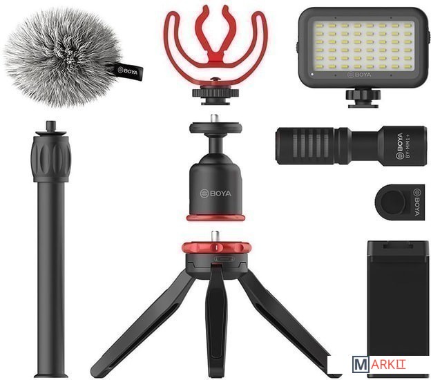 - микрофон BY-MM1+;- съемная ветрозащита;- два аудиокабеля 3.5 мм (TRS - TRRS, TRRS - TRRS);- светодиодная лампа;- зажим для смартфона;- шаровая головка;- мини-штатив;- зажим с креплением для холодного башмака;- чехол;- документация