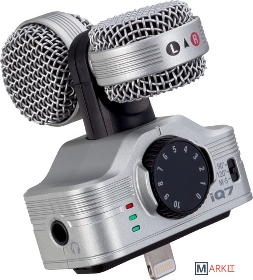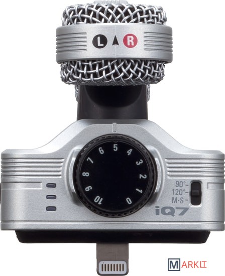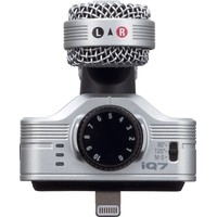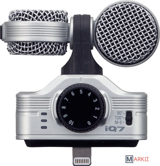 Zoom iQ7 – это стереофонический конденсаторный микрофон, подходящий для записи музыки по технологии Mid-Side, и обладающий компактными размерами для подключения его к коннектору Lightning на iPhone, iPad или iPod Touch.iQ7 включает в себя два микрофонных элемента: направленный микрофон, который захватывает сигнал непосредственно напротив вашего устройства (Mid) и двунаправленный микрофон, который захватывает аудио с двух сторон (Side).Трехпозиционный переключатель дает вам выбор между 90-градусным положением (для фокуса на звуках, исходящих из центра) и 120-градусным (для более широкого захвата, включая фоновой шум в помещении). Третье положение называется “M-S”, оно позволяет вам записывать чистое аудио и настраивать ширину его стерео-поля уже после записи, используя приложение Handy Recorder для iOS.