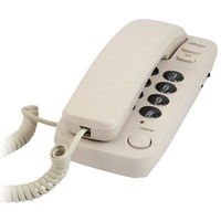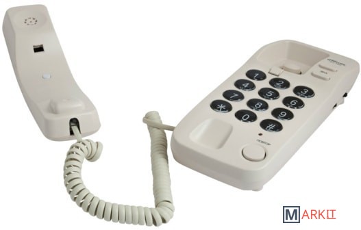 Узкий проводной телефон в настольно-настенном исполнении. Поддерживает как традиционный импульсный, так и современный тональный набор номера.