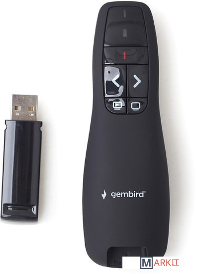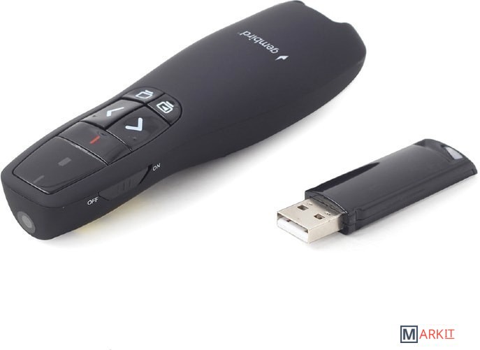 - Беспроводной пульт управления презентацией дляPowerPoint- Лазерная указка красного цвета для концентрациивнимания аудитории в нужной точке- 4 кнопки для управления презентацией: следующий/предыдущий слайд, вкл/выкл экрана, стоп/запускпрезентации, вкл/выкл лазерной указки- Кнопка выключения полезна для экономии батареи- Plug & Play, программного обеспечения не требуется