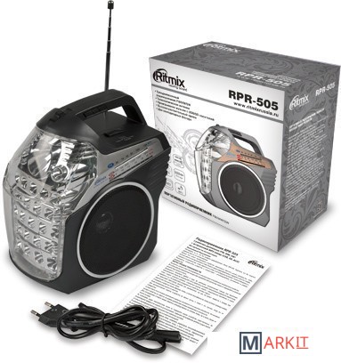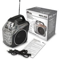 Ritmix RPR-505 — портативный радиоприёмник, работающий на трёх диапазонах, включая FM. Дополнительная функция RPR-505 — воспроизведение MP3-файлов с карт памяти SD или USB-флэшки. Устройство оснащено двумя встроенными светодиодными фонарями.