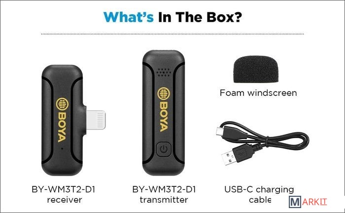 - портативный приемник- портативный передатчик со встроенным микрофоном- поролоновая ветрозащита- кабель для зарядки- документация |