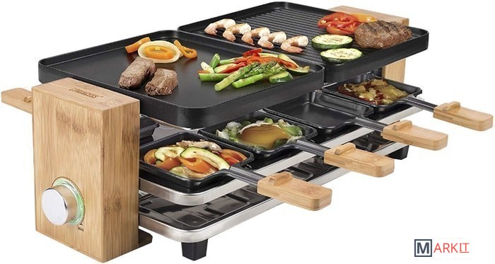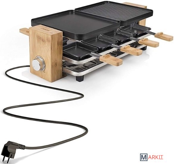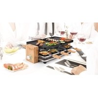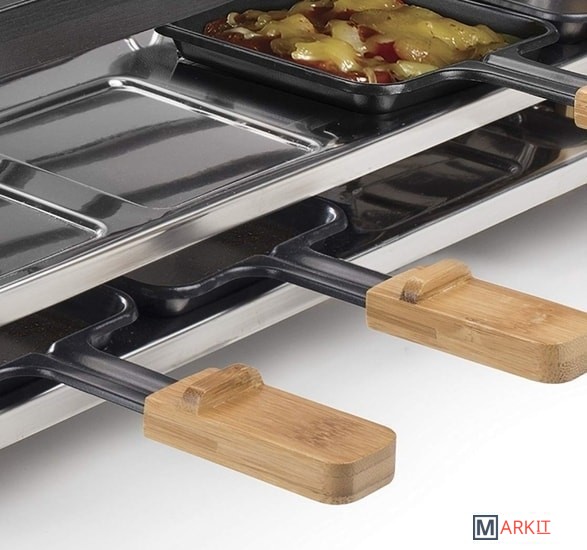 | Комплектация | - 2 съемные двухсторонние панели;- 8 противней для раклета- 8 деревянных лопаток |