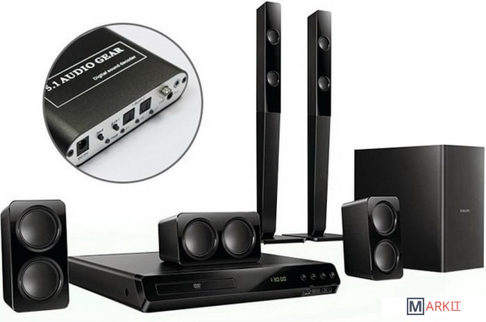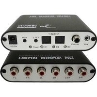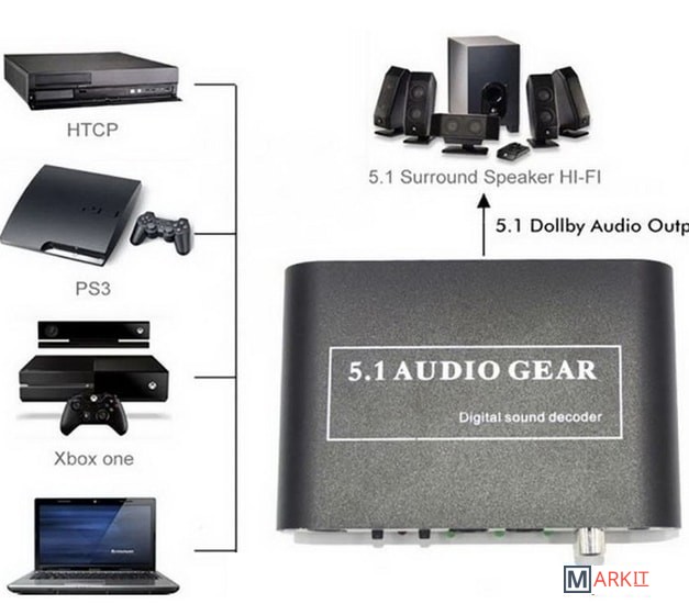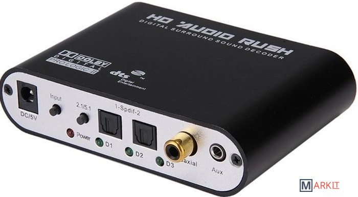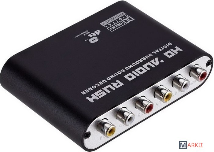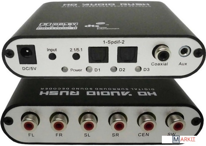 Цифровой аудио декодер преобразует цифровой звук DTS / AC3 / PCM в аналоговый 5.1-канальный или 2.1-стереозвук.Аналоговые стерео (L/R) сигналы после цифровой обработки преобразуются в аналоговый 5.1-канальный выход.Аудиовходы: 2 * Оптические (Toslink), 1 * Коаксиальные, 1 * Стерео 3,5 мм
