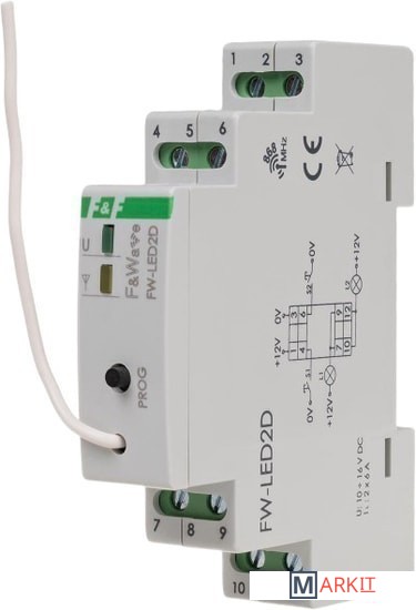 Двухканальный диммер-реле, для LED ламп и LED лент, soft start, локальное и удаленное управление, до 8 радио передатчиков, монтаж на DIN-рейкуМодуль FW-LED2D предназначен для дистанционного управления по радиоканалу (включить/выключить, диммировать) светодиодными лампами и лентами LED с питанием 12 В.- двухканальный модуль;- возможность управления модулем с 8-ми пультов;- местное управление – возможно управлять модулем непосредственно подключенными к его входам моностабильными выключателями (без фиксации);- «Soft start» – плавное изменение яркости при включении и выключении;- ретрансляция сигналов управления – позволяет увеличить дальность радиосвязи;- встроенная электронная тепловая защита – предохраняет устройство от повреждения в случае перегрузки.Дистанционное управление модулем FW-LED2D осуществляется при помощи следующих передатчиков и пультов F&Wave:- FW-RC10 и FW-RC4 – 10 и 4-канальные пульты дистанционного управления;- FW-WSO2 – 2-клавишные выключатели для дистанционного управления (напряжение питания от аккумулятора 3В DC, монтаж на плоскость);- FW-RC5 – 5-канальный передатчик по радиоканалу (напряжение питания от аккумулятора 3В DC, с входами местного управления и отдельными входами ON (сценарий «Вкл. ВСЕ») и OFF (сценарий «Выкл. ВСЕ»);- FW-RC4AC – 4-канальный передатчик по радиоканалу (напряжение питания 230 В АС, с входами местного управления и возможность изменения конфигурации входов S1 и S2 на функцию ON (сценарий «Вкл. ВСЕ») и (или) OFF (сценарий «Выкл. ВСЕ»);- FW-GS-W/B - 4 канальный передатчик по радиоканалу, сенсорный, материал - стекло, исполнение черное и белое.ВНИМАНИЕ!Управляющий вход не работает с выключателями с подсветкой! Передатчики и пульты F&Wave работают c модулем по принципу бистабильного реле: одно кратковременное нажатие кнопки пульта или передатчика включает нагрузку, второе нажатие выключает нагрузку, длительное нажатие (более 1 секунды) увеличивает или уменьшает уровень яркости с шагом 10%.Передатчики FW-RC5 и FW-RC4AC имеют дополнительные входы ON (Сценарий «Вкл. ВСЕ») и OFF (Сценарий «Выкл. ВСЕ»).Учитывая характер передачи и ретрансляции сигнала, не следует использовать одни и те же кнопки на передатчике чаще чем через 2 секунды. Переключение модуля может происходить с небольшим опозданием.Не рекомендуется применение передатчиков FW-RC4 и FW-RC10 для управления группой приемников, т.к. необходимо учитывать возможность нарушения синхронизации включения (особенно при работе на больших расстояниях) или их одновременное использование с местными выключателями.