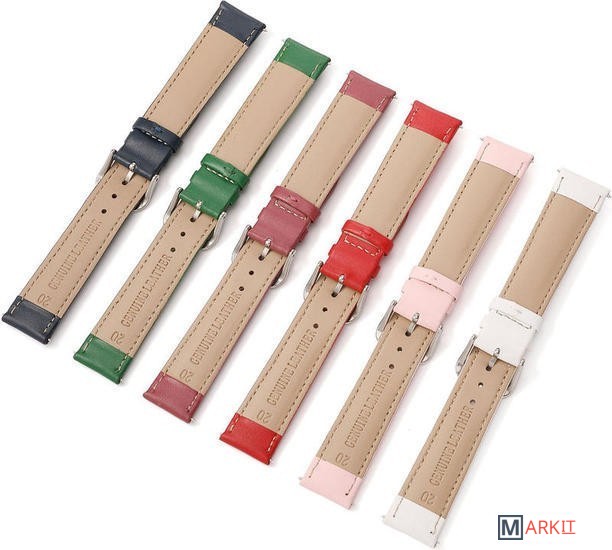 Элегантный кожаный ремешок прямой формы. Изготовлен из натуральной кожи, по краю прошит крашеной нитью, металическая пряжка серебристого цвета. Отлично смотрится на любой руке с любыми часами, в том числе и с классическими.