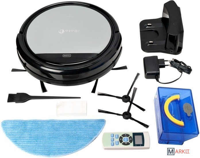 Робот-пылесос;Зарядная станция;Контейнер для влажной уборки;Контейнер для сухой уборки;Пульт ДУ;Сетевой адаптер;Запасные аксессуары: две боковая щетка, салфетка и фильтр;Упаковка.Инструкция по применению;