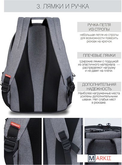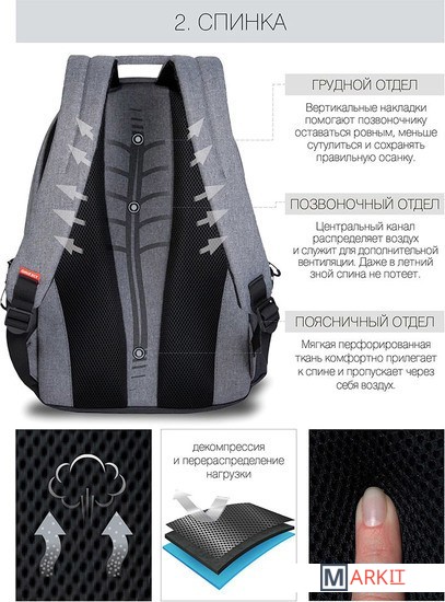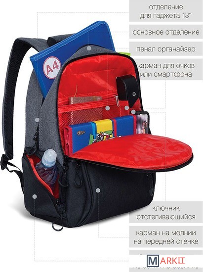 Средняя и старшая школа: мальчик хочет сам выбирать принадлежности, а родителям важно, чтобы они были практичными. Стильный школьный рюкзак GRIZZLY оценят подростки и взрослые. Он в меру строгий со стильным принтом и яркими вставками — нравится детям. Материал — ткань с влаго-грязеотталкивающей пропиткой. Она меньше пачкается, а внешний вид еще долго остается как новый.Мы следим за качеством швов, а нагруженные участки усиливаем. Даже при полной загрузке этот стильный рюкзак долго служит. Помещается в него, кстати, немало.Здесь два основных отделения. Большое для книг, тетрадей или обуви и спортивной формы. Поменьше — для документов и принадлежностей. Много кармашков: два фронтальных, два боковых, внутренние для мелочей, ноутбука и карман-органайзер.Нагрузку от всех принадлежностей снижают жесткая анатомическая спинка и широкие лямки. Ребенок сохраняет правильную осанку.Посмотрите отзывы родителей ниже и добавляйте этот школьный рюкзак в корзину..