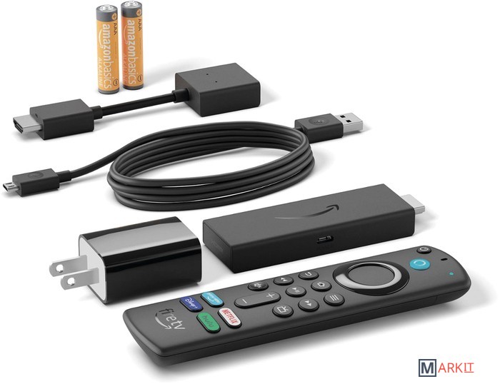 - стик Amazon Fire TV Stick 4K- пульт ДУ Amazon Alexa Voice (3-го поколения)- батарейки для пульта ДУ (2xAAA)- HDMI-удлинитель- USB-кабель- адаптер питания (с вилкой американского типа)- документация