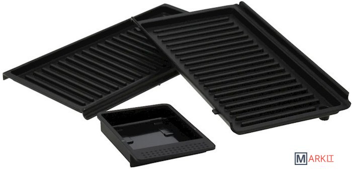 Набор съемных пластин для гриля с антипригарным покрытием, которые можно мыть в посудомоечной машине. Поддон для сбора капель идеально вписывается в машину для удобного сбора остатков жира во время приготовления.