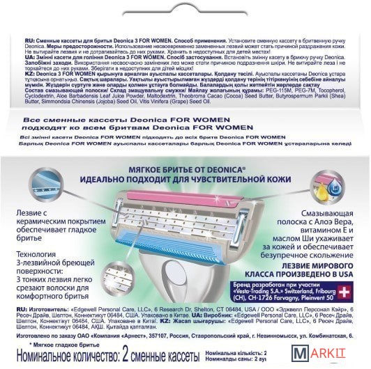 Технология 3-лезвийной бреющей поверхности легко срезает волоски, делая бритье максимально комфортным даже для самой чувствительной кожи. 3 тонких лезвий мирового класса произведены в США, они имеют двойное керамическое покрытие, что гарантирует более точное и чистое бритьеСмазывающая полоска с Алоэ Вера, витамином Е и маслом Ши ухаживает за кожей и обеспечивает безупречное скольжениеЛюбые сменные кассеты Deonica: на 3 или 5 лезвий – можно использовать с любой бритвенной системой DeonicaГладкое и комфортное бритье без раздражений даже на самой чувствительной коже