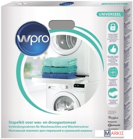 Wpro SKS 101 – универсальный соединительный элемент, с помощью которого стиральную и сушильную машины можно установить друг на друга, чтобы сэкономить место в помещении.Он совместим с моделями, размеры которых составляют 60 на 60 см.Аксессуар оборудован выдвижной полкой, рассчитанной на нагрузку до 10 кг, поэтому вы получите в своё распоряжение дополнительную рабочую поверхность, на которую можно, например, складывать выстиранное или высушенное бельё.