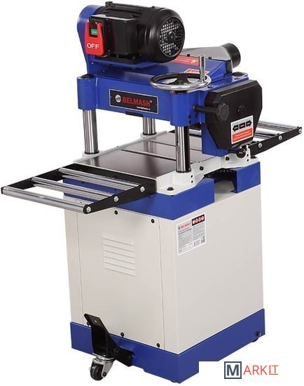Станок предназначен для обработки древесины с целью придания ей необходимых размеров и форм – рейсмусования.Подача осуществляется автоматически. Скорость зубчатого вала подачи регулируется и составляет 5 и 9 м/ мин, принимающий вал – цельный.Для снижения трения заготовки, на рабочем столе установлено два настольных ролика. Дополнительные столы также являются роликовыми.Установлен трех ножевой строгальный вал, который можно заменить на вал helical.В комплекте имеется специальное приспособление для установки ножей.Осуществлена система перемещения станка. Патрубок для отвода стружки имеет диаметр 100 мм. Со стороны подачи установлен ряд защитных упоров, предотвращающих отдачу заготовки во время процесса строгания.