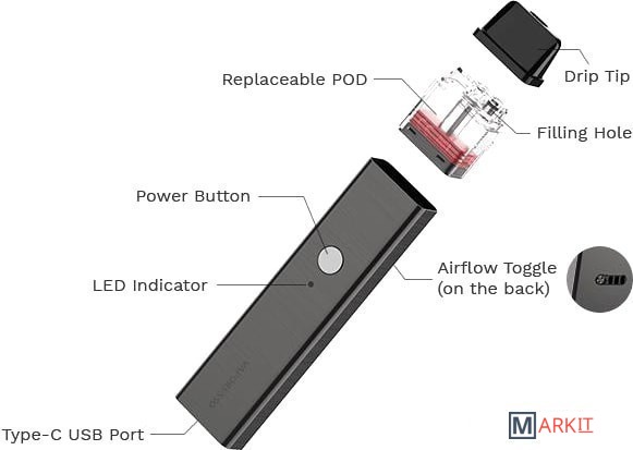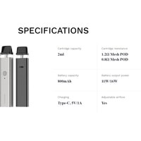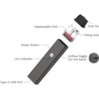 - картридж 2 мл с испарителем 0.8 Ом- картридж 2 мл с испарителем 1.2 Ом- кабель для зарядки- документация |