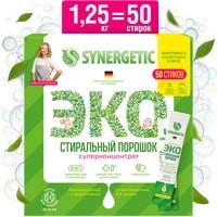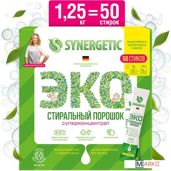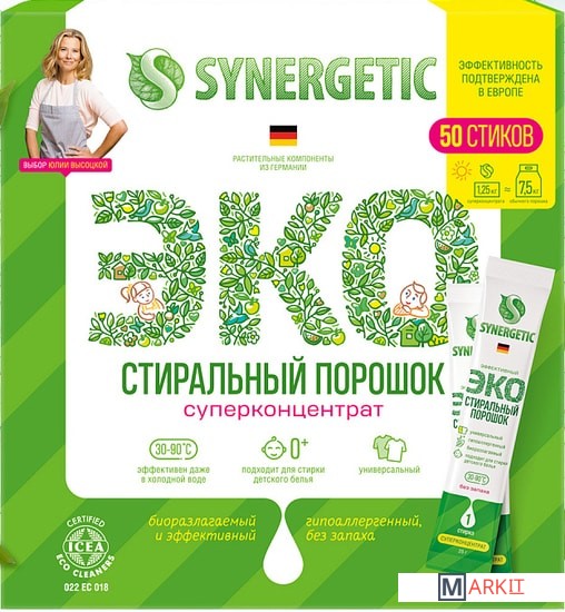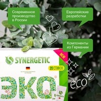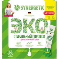 Стиральный порошок в стиках от SYNERGETIC — необычно, удобно и так просто, что даже думать не надо!1 стик — обычная стирка, 2 стика — серьезные загрязнения.Умный суперконцентрат, который занимает в 6 раз меньше места по сравнению с привычным вам средством.25 граммов умного порошка SYNERGETIC заменяют 150 граммов любого другого.Один стик работает так же эффективно, как лидеры рынка, а двойная доза порошка победила всех конкурентов во время исследования.Экологичность:SYNERGETIC удалось создать порошок, который экологичен на всех этапах цикла.Производство:Благодаря отсутствию балластных веществ и современной технологии производства порошок требует в десять раз меньше энергии для производства и сокращает углеродный след.Использование:Экологичные природные компоненты полностью биоразлагаемы и безопасны для аллергиков, астматиков и маленьких детей.