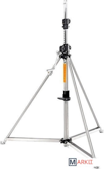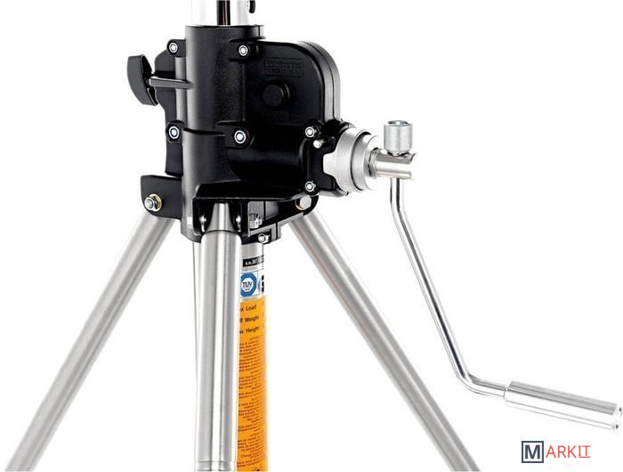 Прочная основательная стойка с усиленными стальными ножками и центральной колонной, хромированными стальными подъёмниками и зубчатым подъемным механизмом. Три секции диаметром 70, 60 и 50 мм. 2 подъёмника, одновременное поднимани каждого на 4,4 см за один поворот ручки. Специальный тросик гарантирует одновремнное опускание всех секций. Быстрая регулировка. Диаметр ножек 35 мм. 1 выравнивающая ножка