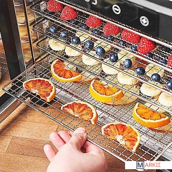 Светодиодный дисплей, 24-часовой таймер с автоматическим отключением6 сушильных решеток из нержавеющей стали, площадь сушки 990 см² на решетку, общая площадь 5940 см²1 сушильный лоток, например, для намазывания фруктовой массы для приготовления фруктовой кожицы1 сетчатый лоток, идеально подходящий, например, для трав, ягод или цветов1 форма для батончиков мюсли на 15 батончиков домашнего приготовленияКорпус из нержавеющей стали, 600 ВтНасадки можно мыть в посудомоечной машинеДлина шнура питания: прибл. 105 см