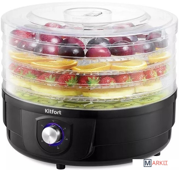 Полезные лакомства круглый год!Электрическая сушилка КТ-1928 предназначена для сушки овощей, фруктов, ягод, грибов, корнеплодов, трав и зелени, а также хлеба. С электросушилкой Kitfort KT-1928 у вас всегда под рукой будет полезная и вкусная еда.Вращающиеся поддоныВ сушилке установлен вал, благодаря которому поддоны вращаются вокруг своей оси, что обеспечивает идеальную сушку продуктов!Управляйте процессом сушки!На передней панели устройства есть регулятор, с помощью которого вы можете включить и выключить устройство, установить температуру в диапазоне от 40 до 70°C. Регулятор имеет плавное переключение температур.Наблюдайте за сушкой!Сушилка имеет в комплекте 5 поддонов из прозрачного пластика, поэтому вы легко можете наблюдать за процессом сушки любимых продуктов. Устанавливайте от 1 до 5 поддонов друг на друга в зависимости от количества продуктов.Равномерная сушкаСушилка оборудована мощным нагревательным элементом и вентилятором, благодаря которым нагретый воздух равномерно распределяется по всему объёму камеры. Прибор КТ-1928 создаёт идеальные условия для качественной сушки продуктов.Легко разобрать и очистить!Все поддоны легко снимаются и моются после сушки. Если на поддоны налипли продукты, замочите их на некоторое время в тёплой воде. После мойки протрите поддоны полотенцем и просушите их.Быстро и вкусно!Для более быстрой сушки порежьте продукты на кусочки. Чем мельче кусочки, тем быстрее они высохнут. При сушке ягод и прочих мелких продуктов положите на поддоны марлю, чтобы ягоды не проваливались сквозь ячейки.Длина шнура: 1 м.Диаметр поддонов: 310 мм.Уровень шума: 40 дБ.