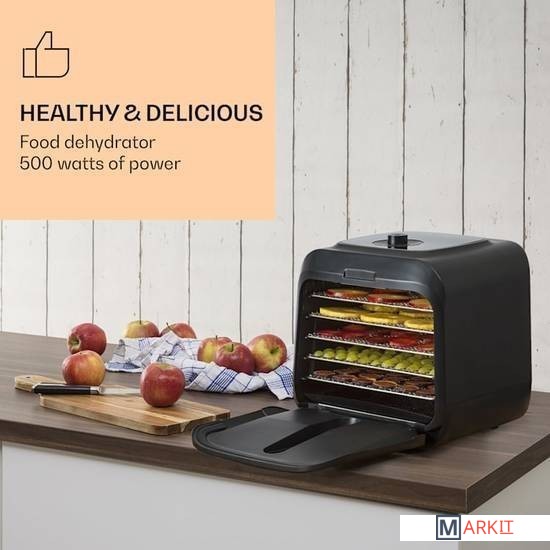 Klarstein Флорида солонина Дегидратор сушит фрукты, овощи, мясо и другие пищевые продукты с использованием инфракрасной технологии при скорости записи, что позволяет производство натуральных фруктов и ингредиентов.Благодаря тепловой мощности 500 Вт с инфракрасной технологией и равномерным распределением тепла, Флорида Jerky сушки машина гарантирует , что плоды высушенные таким же образом , как и в солнце, и само время сушки коротко. Важные минералы и витамины сохраняются во время сушки, а вкус становится более интенсивным. Благодаря полностью автоматическому процессу сушки с четырьмя выбираемыми программами фрукты, мясо, овощи или даже йогурт готовятся легко и без усилий. В дополнительном ручном режиме можно установить температуру от 35 до 75°С и время от 1 до 99 часов.Очистить сушильную машину после окончания процесса очень просто: внутреннюю часть корпуса и сетчатые полки можно без проблем промыть. Корпус изготовлен из прочного пластика и легко моется снаружи.Размеры одной полки: примерно 30 x 24 см (Ш x Г)Длина шнура питания: около 120 см.С воздушным фильтромЖК дисплейЭлектропитание: 220-240 В ~ | 50/60 Гц
