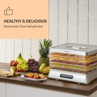 Элементы управления просты для понимания: поместите нарезанные и / или предварительно приготовленные продукты на полки, установите температуру сушилки на 35-70 ° C с помощью светодиодного дисплея и установите таймер на 1-48 часов. Готовый. Температуру и время, конечно, можно отрегулировать в любое время, если требуется более слабая или более сильная сушка. Важные минералы и витамины сохранятся при сушке, вкус станет более интенсивным.Очистить сушилку после завершения процесса сушки несложно: внутреннюю часть конструкции и решетки можно без проблем промыть. Корпус изготовлен из прочного пластика и легко моется снаружи.Размеры одной полки: примерно 39 х 26,5 см (Ш х Г)Длина сетевого кабеля: около 100 см