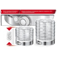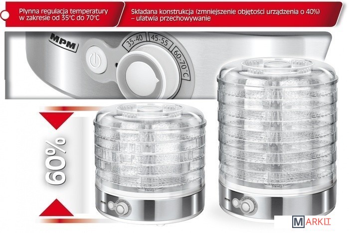без бисфенола-Аоснование из нержавеющей сталибыстро и эффективно сушит: грибы, фрукты, овощи, цветы и зелень5 прозрачных сит диаметром 31 см.плавная регулировка температуры в диапазоне от 35°С до 70°Ссита регулируемые по высоте от 2,5 до 5,0 смскладная конструкция (уменьшение объема устройства на 40%) - облегчает хранениеэлектропитание: 230 В 50 Гцмощность: 500 Вт