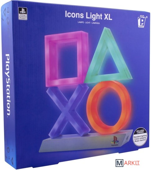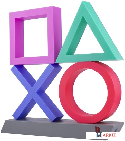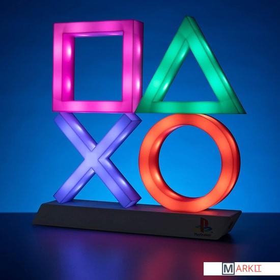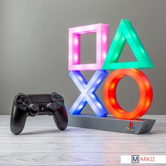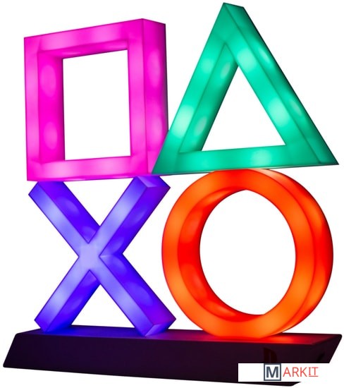 Подсветка с классическими символами кнопок контроллера PlayStation на гладком черном постаменте;Выберите один из 3 режимов освещения: стандартное освещение, фазировку цвета и реагирование на музыку;Этот продукт изготовлен с использованием BDP, что расшифровывается как Breakdown Plastic - органическая добавка, которая помогает пластику разлагаться на свалке, не влияя ни на его структурную целостность (до захоронения), ни на пригодность продукта к переработке.Питание: USB-кабель или 3 батарейки AAA (не входят в комплект);Playstation Icons Light - это официально лицензированный продукт.