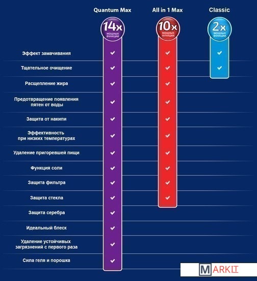 Finish QuantumFINISH QUANTUM содержит в себе 12 функций:1. эффективная очистка; 2.функция отмачивания; 3. удаление чайного налета;4.функция соли; 5. функция ополаскивателя; 6.предотвращение образования накипи;7.эффективное расщепление жира; 8. использование низкотемпературных режимов; 9.защита фильтра;10.защита стекла; 11.защита серебра; 12. придает блеск посуде.