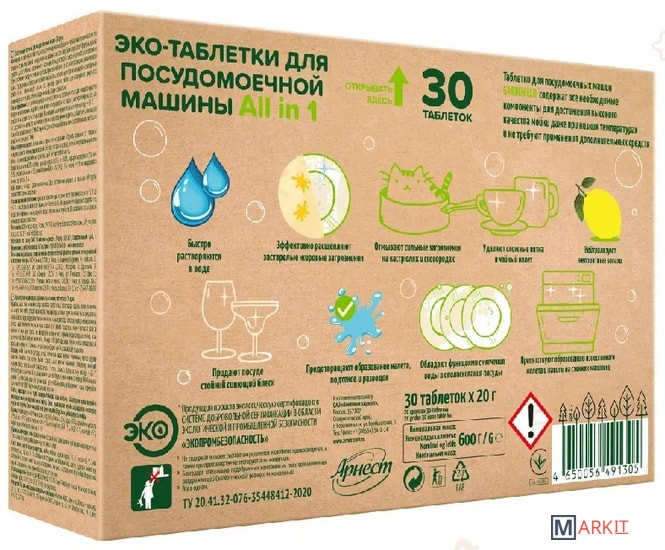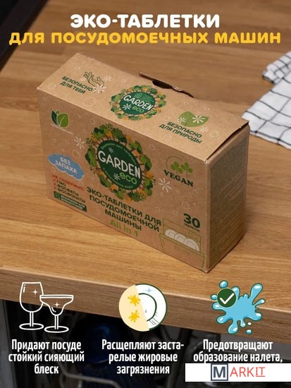 Используя Эко таблетки для посудомоечной машины Garden Eco, не нужно добавлять соль или ополаскиватель. Они бесследно удаляют подсохшие остатки пищи, налет, жир, пригоревшую пищу на кастрюлях. Благодаря специальным энзимам таблетки для посудомоечных машин Гарден эко эффективны против загрязнений в холодной воде.Каждая таблетка запакована в водорастворимые капсулы, которые не нужно вскрывать, оболочка полностью растворяется в процессе мойки. Таблетки для посудомоечной машины биоразлагаемые, не вредят бактериям в домах с септиками, подходят для ежедневного применения.В таблетках для посудомойки Eco Garden не содержатся: фосфаты, хлор, фосфонаты, цеолиты, ГМО, SLS, парабены. Таблетки для посудомоечной машины детские, экологичные, полностью выполаскиваются водой, усиливают естественный блеск стекла, фарфора или пластика.