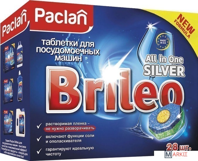 Markit » Средства для посудомоечных машин » Таблетки для посудомоечной машины Paclan Brileo All in One Silver 28 шт