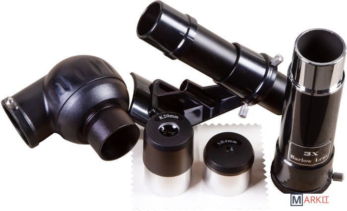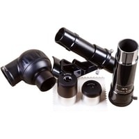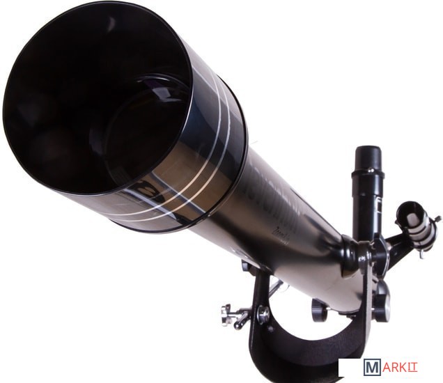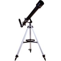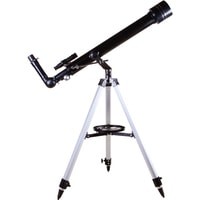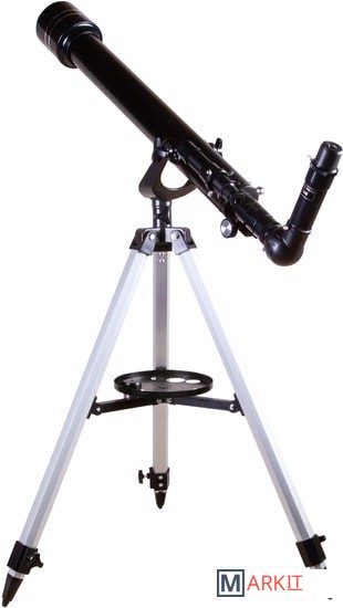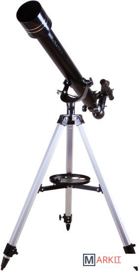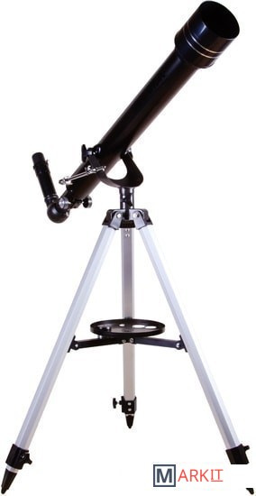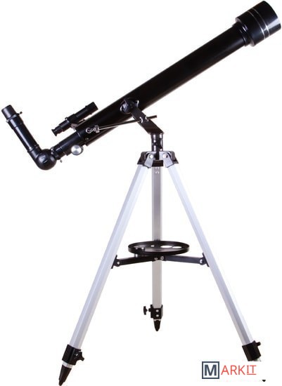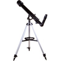 Levenhuk Skyline BASE 60T – рефрактор, в который можно рассматривать кратеры на Луне, фазы Венеры, слабые и двойные звезды, наземные объекты. И хоть в Levenhuk Skyline BASE 60T можно увидеть многие красоты нашей Вселенной, лучше всего он отображает ближний космос. Поэтому начинающий астроном или ребенок, интересующийся наукой, оценят его больше других. Благодаря простому управлению и хорошей комплектации этот телескоп отлично подходит для первых наблюдений и способен стать желанным подарком для многих любителей астрономии.Внутри телескопа установлена стеклянная оптика с полным просветлением. Линзы передают четкое и контрастное изображение, не мутнеют со временем, хорошо работают по тусклым объектам. Оптическая труба установлена на азимутальную монтировку. Для ее освоения требуется совсем немного времени – управление телескопом быстро освоит даже ребенок. В поиске объектов на небосклоне или горизонте помогает и оптический искатель. Он идет в комплекте с телескопом и дает 5-кратное увеличение.Кроме искателя в коробке с телескопом есть и другие аксессуары. Два окуляра служат для правильного подбора увеличения. С короткофокусным окуляром кратность оптики увеличивается до 175х, с длиннофокусным уменьшается до 35х. Чем больше увеличение, тем больше деталей можно увидеть на космических объектах, малое увеличение же помогает в изучении протяженных объектов. В комплект поставки включена и диагональная призма. Этот аксессуар используется при изучении наземных объектов. Телескопы передают перевернутую картинку (верх и низ меняются местами), а при ландшафтных наблюдениях это неудобно. Диагональная призма исправляет эту перевернутость, делая картинку более привычной глазу.Для установки телескопа используется алюминиевая тренога. Она устойчивая и надежная. Благодаря ножкам, длину которых можно регулировать, тренога прочно стоит даже на неровных поверхностях. Есть лоток для аксессуаров.