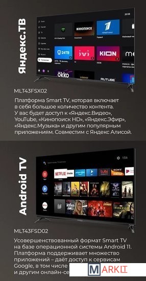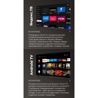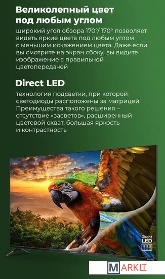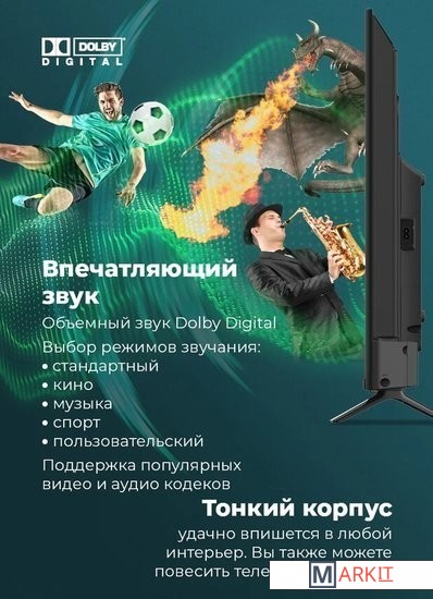 Direct LED технология подсветки при которой светодиоды расположены за матрицей. Преимущества такого решения — отсутствие засветов, равномерность подсветки, большая яркость.Wi-Fi и Bluetooth. Поддержка различных проводных интерфейсов.Разрешение экрана Full HD — каждый кадр отличается исключительной передачей деталей и яркостью.Android 11 для Android TV сосредоточена на улучшении производительности, удобства и безопасности системы. ОС используется для просмотра телетрансляций, сетевого контента популярных видеосервисов.Dolby Digital совершенная технология звука, позволяющая создавать более качественный, объемный звук при меньшей скорости потока данных.
