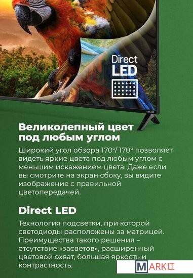 Direct LED технология подсветки при которой светодиоды расположены за матрицей. Преимущества такого решения — отсутствие засветов, равномерность подсветки, большая яркость.Wi-Fi и Bluetooth. Поддержка различных проводных интерфейсов.Разрешение экрана Ultra HD обеспечивает очень высокое качество изображения. Благодаря высокой плотности пикселей технология преобразует свет в потрясающую цветовую палитру, выдавая четкую, реалистичную картинку.Android 11 для Android TV сосредоточена на улучшении производительности, удобства и безопасности системы. ОС используется для просмотра телетрансляций, сетевого контента популярных видеосервисов.Dolby Digital совершенная технология звука, позволяющая создавать более качественный, объемный звук при меньшей скорости потока данных.