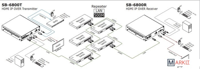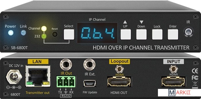 Удлинитель (передатчик) HDMI, IR, RS232 до 100 метров (FULL HD) по витой паре. Передача видео по сети IP (необходим в сети гигабитный свитч с IGMP). Одновременная работа до 5 источников сигнала и до 64 приемников.Разрешение видео до 1080p@36 bit@60Hz@100 метров@CAT6/CAT6a/CAT7, расстояние до 500м при использовании свитчей или повторителей-роутеров). Поддержка аудио Dolby TrueHD, Dolby Digital, Dolby Digital Plus, DTS, DTS-HD, DTS-HD Master, DTS-ES 6.1., PCM-2CH. Требуется приемник SB-6800R.