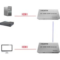 Активный удлинитель сигнала HDMI на 100м по витой паре RJ45 предназначен для передачи сигнала высокой четкости на расстояние до 100 метров вместо кабеля HDMI. Передача сигнала осуществляется по одному кабелю Cat-5e или Cat-6 (рекомендуется). Максимально поддерживаемое разрешение UltraHD 3840х2160 30Гц. !!!Внимание заявленное производителем расстояние передачи изображения в качестве 4К до 70 метров.