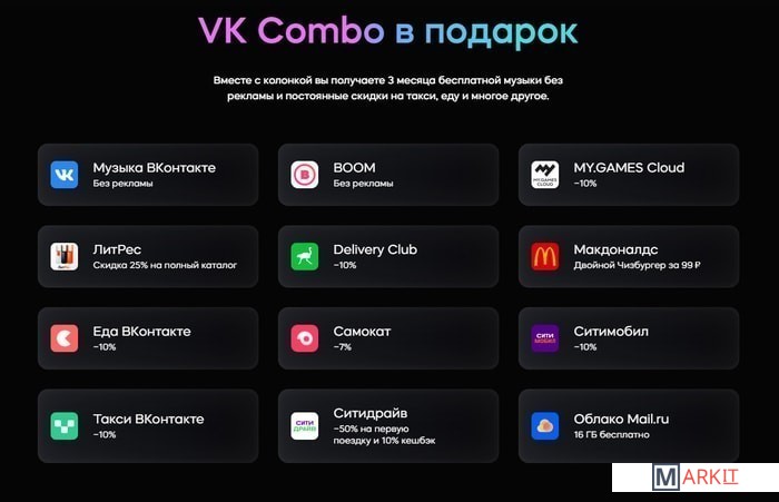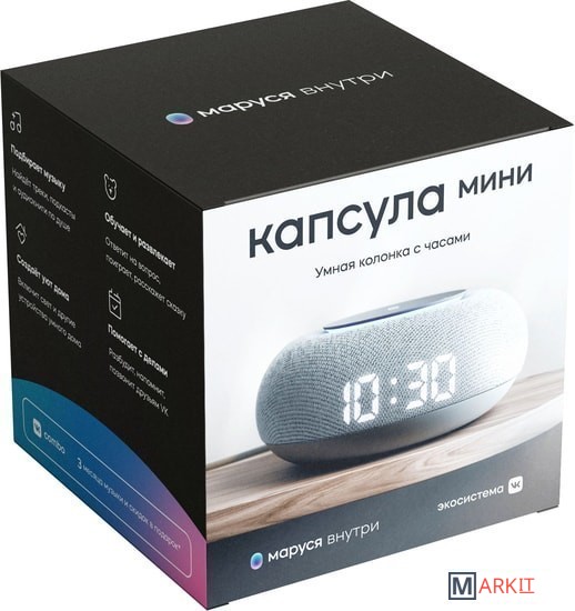 Основные особенности:- голосовой помощник "Маруся" (с индикатором работы в виде светового кольца)- интеграция в систему умного дома- адаптивный дисплей (подстраивается под освещение)- отображение на экране времени и погоды- прослушивание новостей и электронной почты- встроенные игры для ребенка- звонки ВКонтакте- полная интеграция с плейлистами во ВКонтакте- поддержка Spotify Connect- сенсорное управление- 4 микрофона (с кнопкой включения и отключения)Для того, чтобы использовать все возможности устройства, необходимо:- подключение к интернету по сети Wi-Fi- аккаунт во ВКонтакте- фирменное приложение (которое можно скачать в App Store или Google Play)Кроме того, в комплект поставки входит бесплатная трехмесячная подписка на сервис VK Combo.