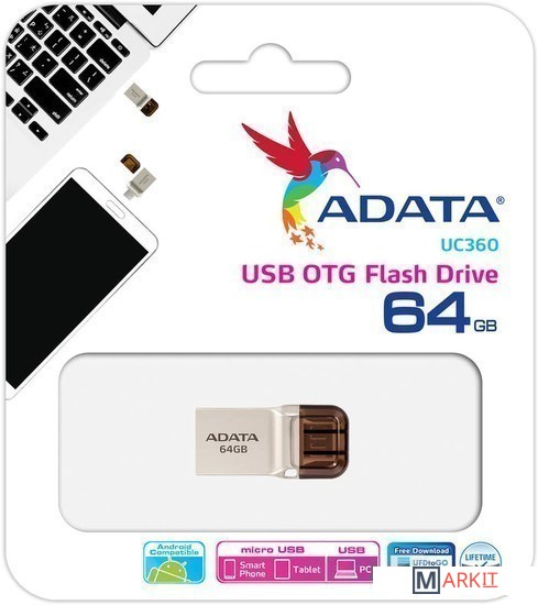В маленьком корпусе флэш-накопителя OTG USB UC360 имеются встроенные разъемы USB 3.1 и microUSB, благодаря чему данный накопитель удобно использовать для передачи данных между такими различными устройствами, как смартфоны, планшеты и ПК. Этот флэш-накопитель устойчив к попаданию влаги, пыли, к ударам, а также оснащен аккуратным ременным креплением для удобства переноски.