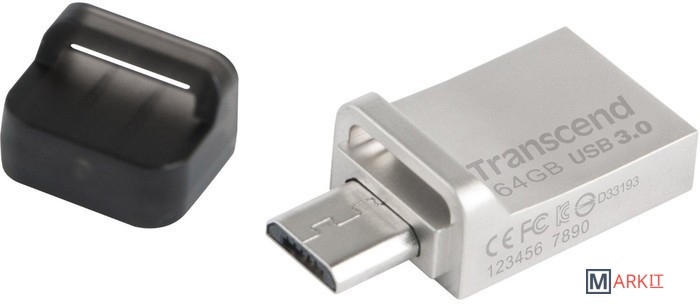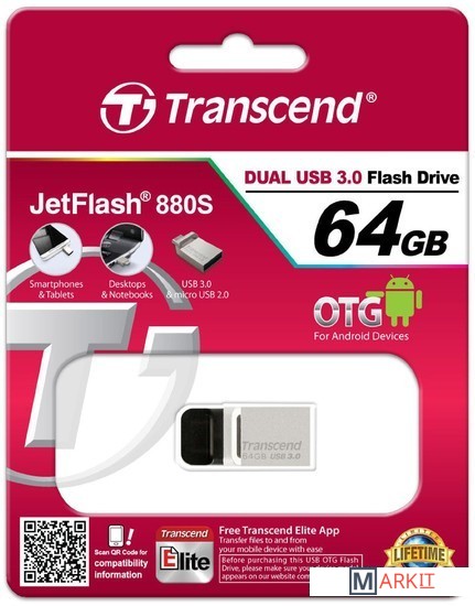 На одном конце JetFlash 880 располагается полноразмерный разъем SuperSpeed USB 3.0, который дает возможность подключить флэш-накопитель к любому оснащенному интерфейсом USB устройству и обеспечивает в 10 раз большую пропускную способность, чем USB 2.0. На другом конце накопителя находится разъем micro USB для подсоединения к мобильным устройствам.Благодаря технологии производства COB (Chip on Board) накопители JetFlash 880 полностью пыле- и влагонепроницаемые.