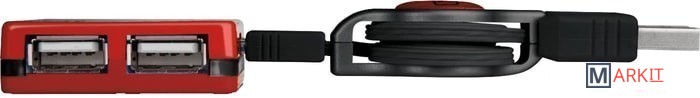 Внешний четырехпортовый концентратор USB 2.0. Концентратор имеет квадратную форму, в которой два USB-порта расположены слева и справа. Максимальная скорость передачи 480 Мбит/с. Он включает в себя убирающийся кабель с возвратным механизмом длиной 0,6 м.
