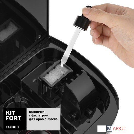 С заботой о вашем самочувствииУльтразвуковой увлажнитель воздуха Kitfort KT-2803 увлажняет воздух в помещении и очищает его с помощью ультрафиолетовой лампы от грибков и бактерий, создавая хороший микроклимат для проживания людей.Подстраивается под васВ увлажнителе Kitfort KT-2803 с помощью кнопок на передней панели можно установить интенсивность тумана, включить или выключить подсветку панели.Любимый аромат у вас дома!В комплекте идёт ванночка с фильтром для ароматического масла, чтобы наполнить воздух в комнате приятным ароматом.Карбоновый HEPA-фильтрНаряду с очищением от всякого рода загрязнений, данный тип фильтров задерживает аллергены, бактерии, вирусы, а также избавляет от неприятных запахов, табачного дыма и гари.Прост в уходеЛегко разбирается и быстро моется!