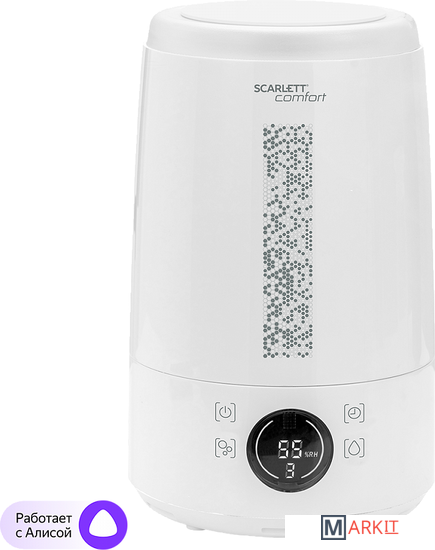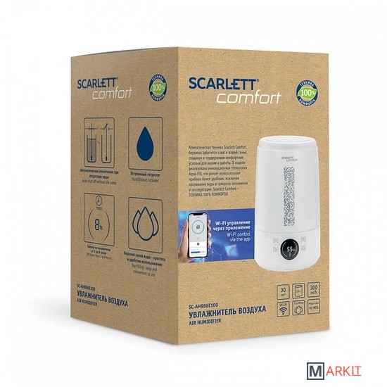 Увлажнитель воздуха SC-AH986E100 оснащен функцией верхнего долива воды для максимально комфортного использования прибора. Нет необходимости выемки резервуара, что позволяет избежать разбрызгивания воды. Резервуар вмещает в себя 3.5 литра воды, чего достаточно для увлажнения помещения площадью до 30 квадратных метров. Встроенный гигростат дает возможность регулировать влажность воздуха в помещении и отображает на дисплее текущий уровень влажности, что помогает создать оптимальный микроклимат. Для удобства управления через приложение с вашего смартфона, прибор оснащен Wi-Fi функцией.При отсутствии воды в увлажнителе, прибор автоматически отключается для сохранения длительного срока службы.
