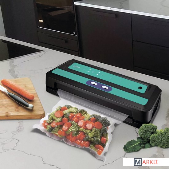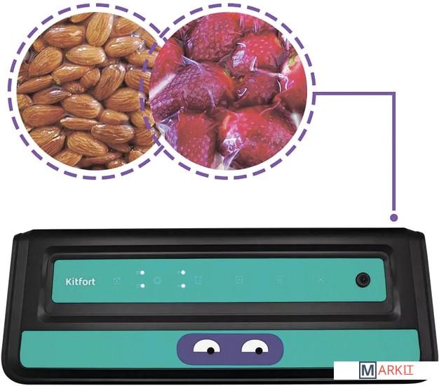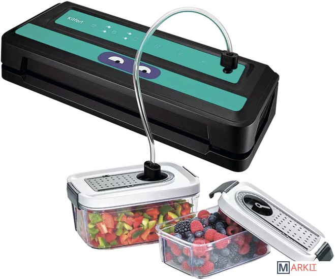 Вакууматор Kitfort КТ-1531 обеспечит долгие сроки хранения ваших любимых продуктов. Продукты, упакованные под вакуумом, сохраняют дольше аппетитный вид, вкус и полезные свойства, а портятся существенно дольше по сравнению с обычными условиями хранения.Открытый край пакета укладывается под крышку прибора, и после выбора режима, вакууматор выкачает из него воздух. В результате образования вакуума пакет плотно обжимает содержимое. Как только воздух удалён, начинается запечатка открытой стороны пакета.«Контейнер» – откачивание воздуха из контейнеров; «давление» - выбор нормального и низкого давления; «режим» - выбор режима запечатывания для сухих или влажных продуктов; «авто» - автоматическая упаковка; «запечатывание» - запечатывание шва пакета.У КТ-1531 есть режимы для вакуумирования сухих, влажных и мягких продуктов с различным временем запечатывания. Влажные продукты могут намочить край пакета, поэтому время запечатывания требуется увеличить.У КТ-1531 можно активировать режим откачки воздуха из контейнеров. Вакуумирование проиходит при помощи шланга, вставленного в фитинг вакууматора одним концом, а другим в крышку контейнера. Вы можете дополнительно приобрести набор контейнеров КТ-1500-10.С нашей техникой очень легко подружиться, потому что она не только лёгкая и функциональная, но и будто живая с весёлыми глазами. Никого не оставит равнодушным. В любой момент вы можете отклеить этот стикер без вреда для поверхности.Создаваемое разрежение (максимум): 0.8 бар.Ширина шва: 2.5 мм.Уровень шума: ≤ 80 дБ.Длина шнура: 0.9 м.