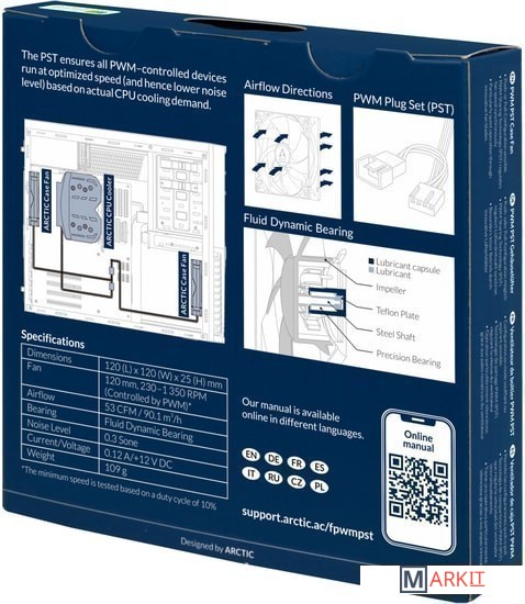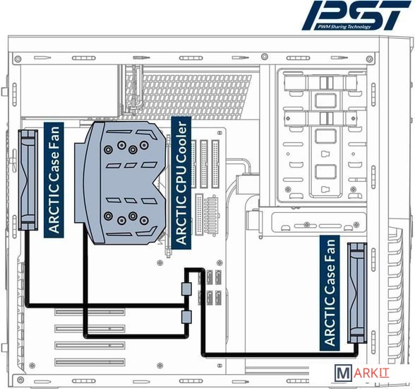 Вентилятор с поддержкой технологии PST от Arctic - возможность подключения цепочкой до 5 вентиляторов от одного 4pin разъема. Процессорный вентилятор должен быть последним в цепочке.