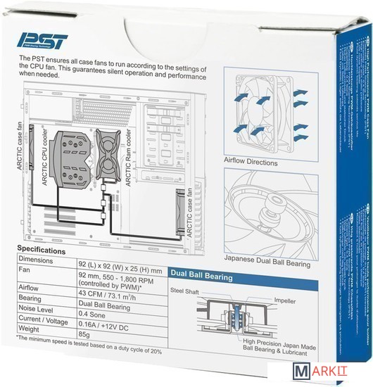 Вентилятор с поддержкой технологии PST от Arctic - возможность подключения цепочкой до 5 вентиляторов от одного 4pin разъема. Процессорный вентилятор должен быть последним в цепочке.