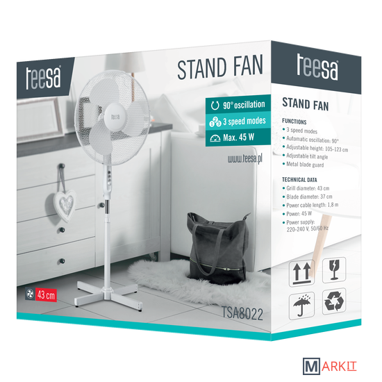 Автоматическое колебание: 90°Регулируемая высота: 105-123 смМеталлическая защита пропеллераМощность: 45 ВтДиаметр гриля: 43 смДиаметр лезвия: 37 смДлина шнура питания: 1,8 мЭлектропитание: 220 ~ 240 В; 50/60 Гц