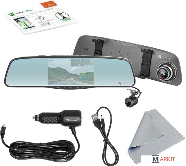 NAVITEL MR250 – 5-дюймовое smart-зеркало заднего вида, которое сочетает в себе функции, необходимые для безопасного вождения. Устройство оснащено видеорегистратором, который записывает все, что происходит на дороге перед вашим автомобилем, и дополнительной камерой заднего вида. Зеркало встроено в прочный металлический корпус. Камера заднего вида устойчива к воздействию влаги и может крепиться снаружи автомобиля на рамку номерного знака.