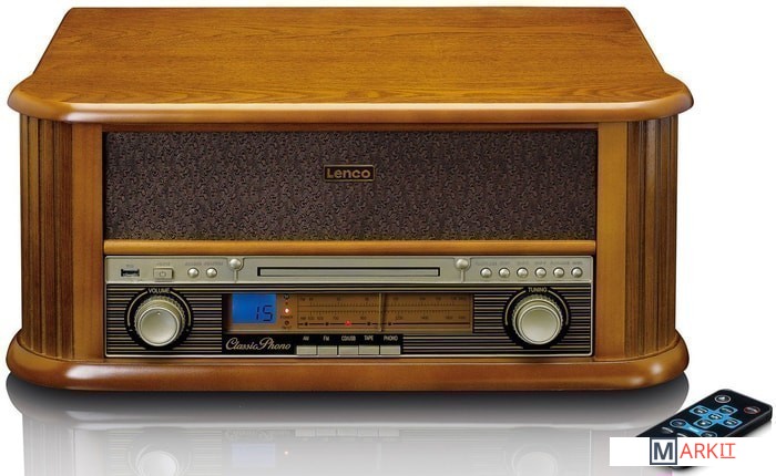 Lenco TCD-2550 выполнено в дизайне популярных в середине прошлого века радиол и станет отличным дополнением интерьера в винтажном стиле. Под поднимающейся верхней крышкой Lenco TCD-2550 находится проигрыватель винила — именно так было сделано и практически во всех классических радиолах. Имеется возможность воспроизведения дисков на трех скоростях (33, 45 или 78 об/мин) с пластинок любых форматов. Проигрыватель оснащен легким тонармом с предустановленным звукоснимателем и очень прост в использовании. В данной модели предусмотрен автостоп, при срабатывании которого тонарм возвращается в исходную позицию. Еще одним источником сигнала в Lenco TCD-2550 является CD-проигрыватель. Коллекции CD имеются в распоряжении многих меломанов, поэтому возможность их прослушивания на этой системе наверняка будет востребована. Предусмотрена возможность проигрывания аудиокассет.В системе Lenco TCD-2550 имеется и встроенный FM-тюнер, что также соответствует оснащению классической радиолы. Для настройки на радиостанции используется традиционная шкала с верньером, что придает модели дополнительный шик. Вся необходимая информация выводится на небольшой ЖК-дисплей, который очень удачно вписан во фронтальную панель. Современные технологии в Lenco TCD-2550 представлены функцией воспроизведения музыкальных файлов с USB-накопителей. Более того, в данной модели предусмотрена и возможность простой записи на подключенную флешку музыки с пластинок для прослушивания на других цифровых устройствах. Система комплектуется полнофункциональным пультом ДУ.По обеим сторонам корпуса Lenco TCD-2550 расположены динамики, которые подключены к усилителю мощностью 2 х 4,5 Вт.